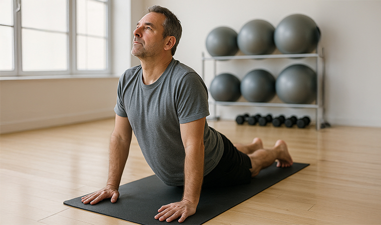 A gentle back extension, or Gentle Upward Dog, is an excellent stretch for relieving lower back tension and improving posture. By pressing the chest up while lying on the stomach, this move lengthens the front of the body, gently arcs the spine, and strengthens supporting muscles.